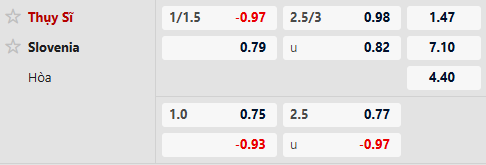 Thông tin tỷ lệ kèo bóng đá Thụy Sĩ vs Slovenia: