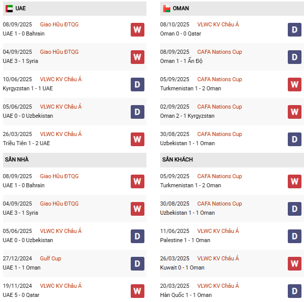 - UAE thắng 4, hòa 5, thua 1 trong 10 trận gặp Oman gần đây.