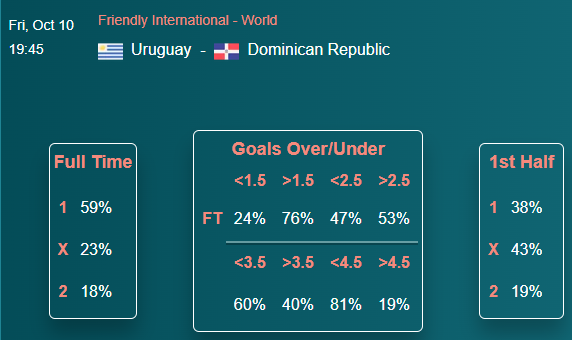 Trong 5 trận đấu gần nhất của Uruguay, đã có tổng cộng 7 bàn thắng được ghi (trung bình 1,4 bàn/trận), trong khi con số của CH Dominican là 16 bàn (trung bình 3,2 bàn/trận). Dựa trên số liệu này, khả năng trận đấu có dưới 3 bàn thắng là rất cao.