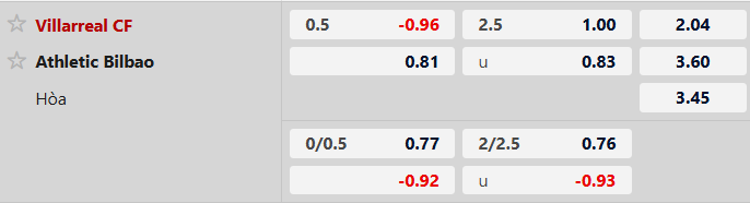 Thông tin tỷ lệ bóng đá Villarreal vs Athletic Bilbao: