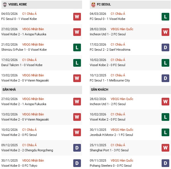 Thống kê phong độ Vissel Kobe vs Seoul: