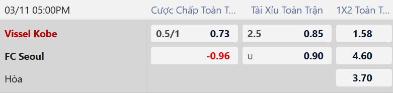 Thông tin tỷ lệ bóng đá Vissel Kobe vs Seoul: