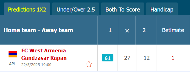 Thông tin tỷ lệ West Armenia vs Gandzasar: