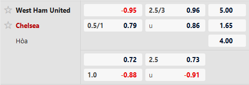 Thông tin tỷ lệ kèo cả trận West Ham vs Chelsea: