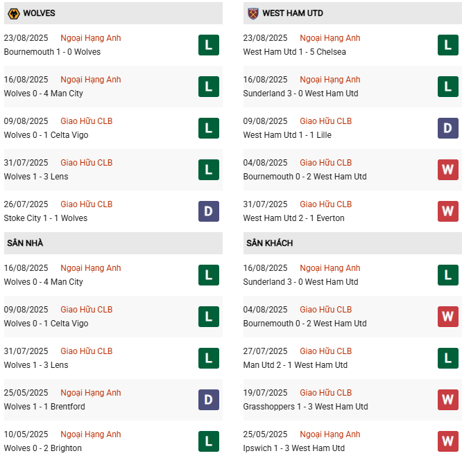 - Wolves thắng 4, thua 6 trong 10 trận gặp West Ham United gần đây.