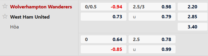 Thông tin tỷ lệ kèo bóng đá Wolves vs West Ham United: