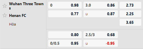 Tỷ lệ kèo hòa được thua xuất hiện ở trận đấu này. 7/8 trận liên tiếp của Wuhan Three Towns đều làm buồn lòng giới đầu tư khi thua kèo. Trong khi 6/9 trận gần đây Henan đều thắng kèo. Do vậy, có thể đội khách sẽ là chọn lựa không tồi cho các nhà đầu tư ở mảng kèo châu Á.